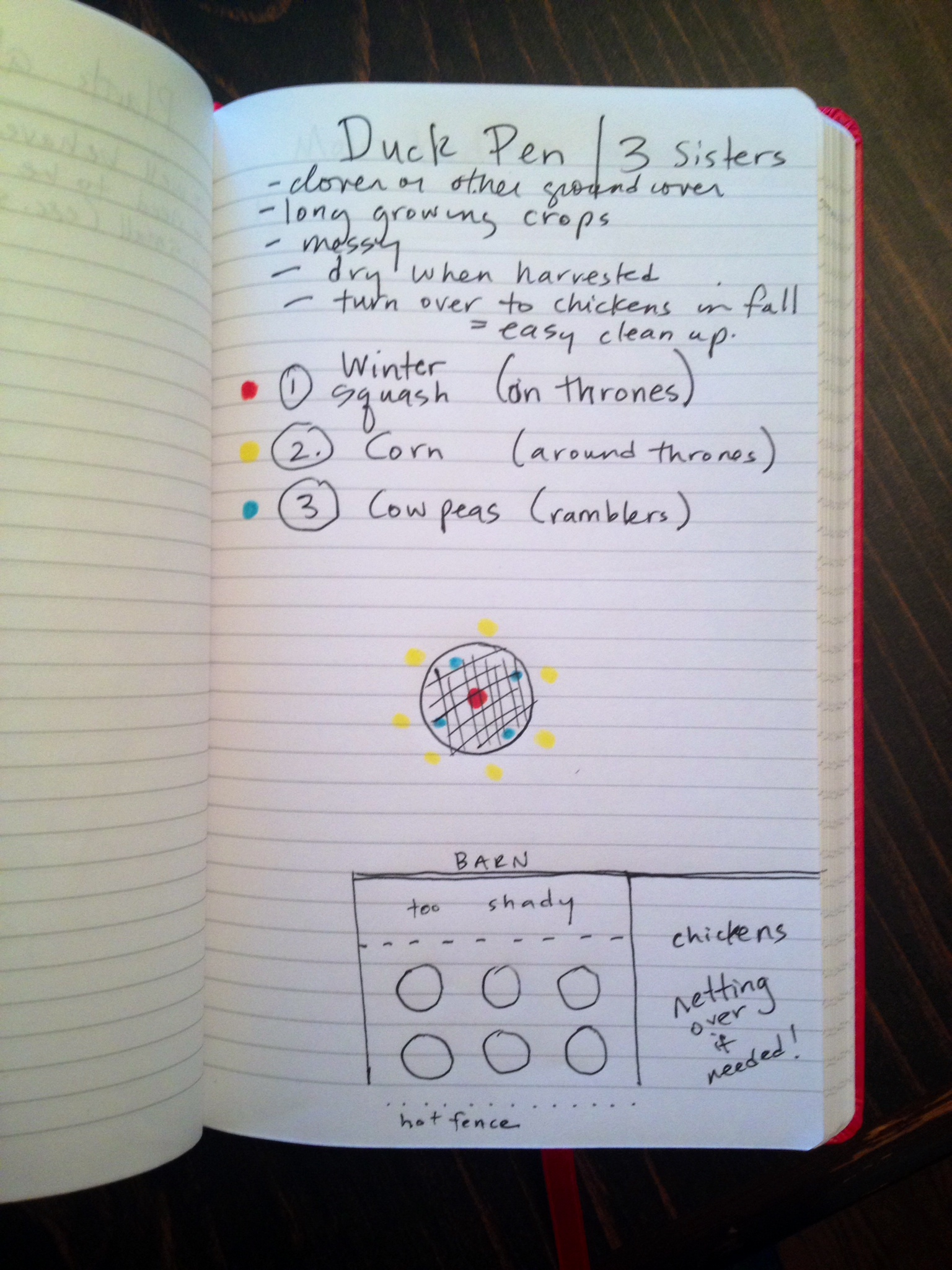 ideas for the “duck pen” or “3 sisters” plot- the 6 + circles will be “thrones” planted in the color-coded pattern above.