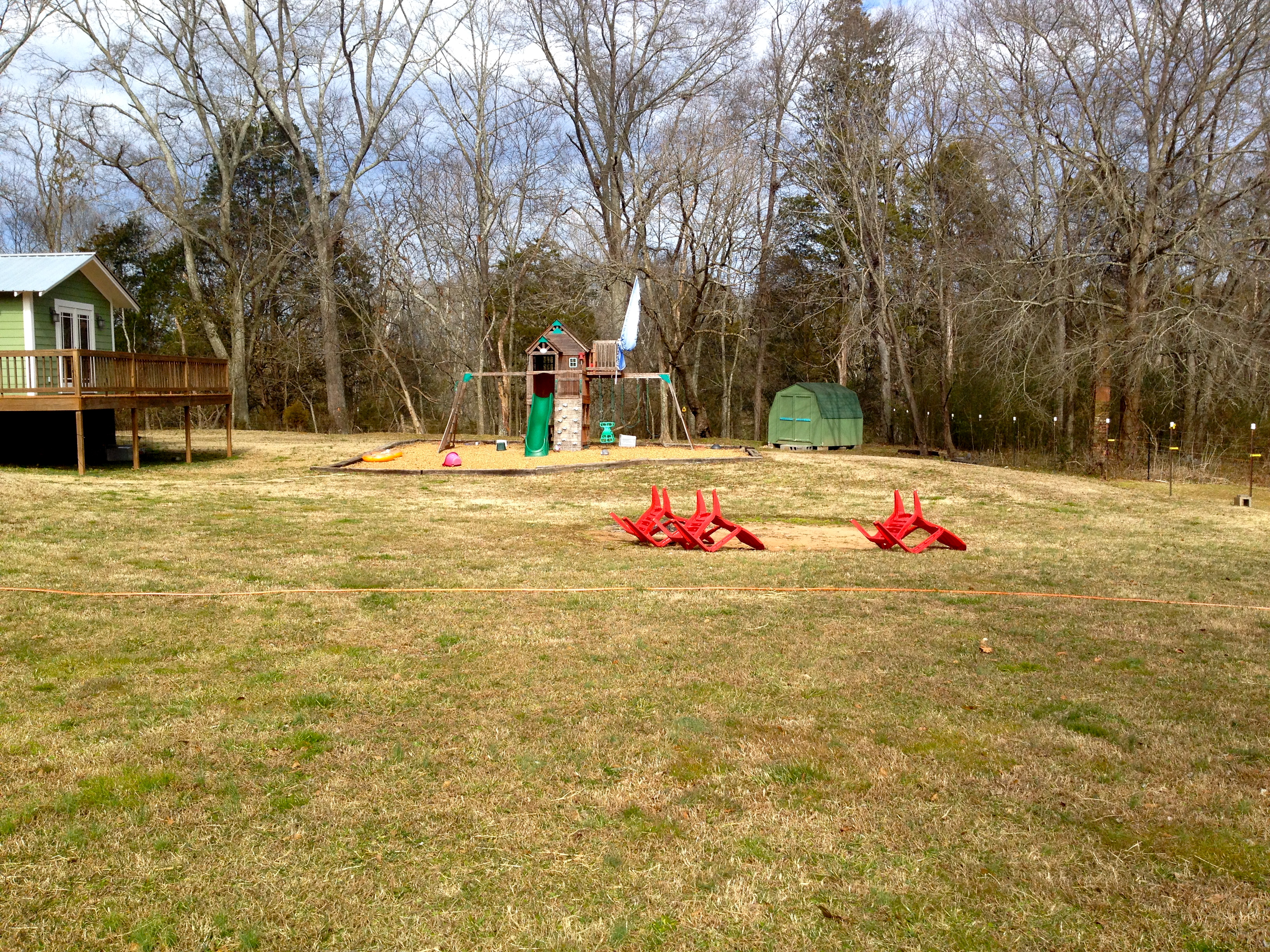 (option B.) Downsides: Observation area is an uncovered deck. (Alabama summers . . . gasp. Ack.), it is farther from free/easy water (runoff), part of it has poor drainage (rice? kidding!), the kids would leave me to hide in their fort, and to be honest- I want this to eventually be small riding arena. (Garden, don’t be greedy. Don’t take my flat area!) So it is a pretty far down the list “option B.”